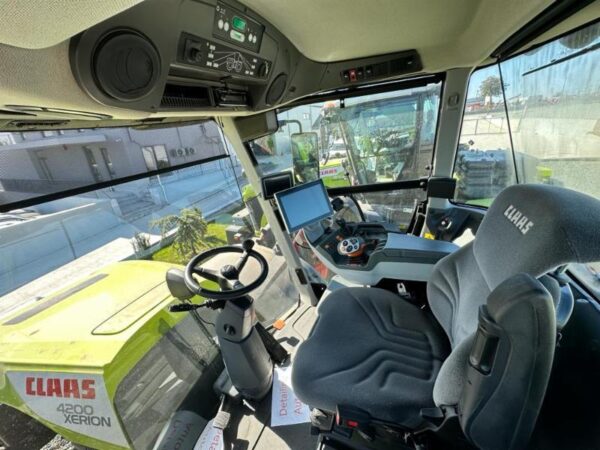 Tractor Claas Xerion 4200 Trac din 2021, motor Mercedes, 6 cilindri în linie, 462 H.P., 1707 ore motor, computer de bord, instalație de climatizare automată, radio, frigider, aparat foto, lumini de lucru și faruri cu led, scaun cu suspensie activă și încălzite, oglindă cu unghi larg reglabilă electric, circuit hidraulic de detectare a sarcinii, vinci frontal, PTO spate 1000, greutăți față 480 kg, cauciucuri noi Michelin.